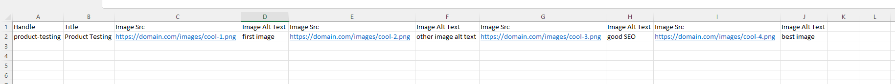 You can list also Image Alt Text and Image Position columns for each Image Src column in your file.