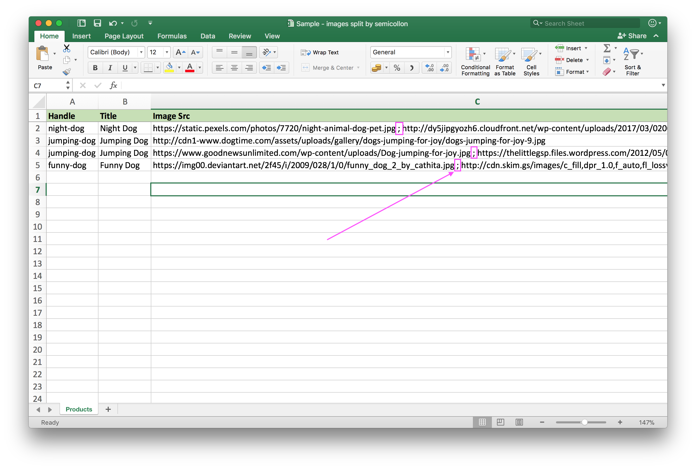 ;(semicolon) in the same cell. As visible in the example image with Product “Jumping Dog”. - Remember to name the sheet/tab “Products”, so that the app knows which sheet contains Products import.