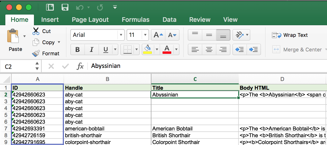 At first, an item is identified by “ID” column value. ID is the Shopify internal identifier for an item. You can’t assign them by yourself – you can only get them out by exporting existing items.