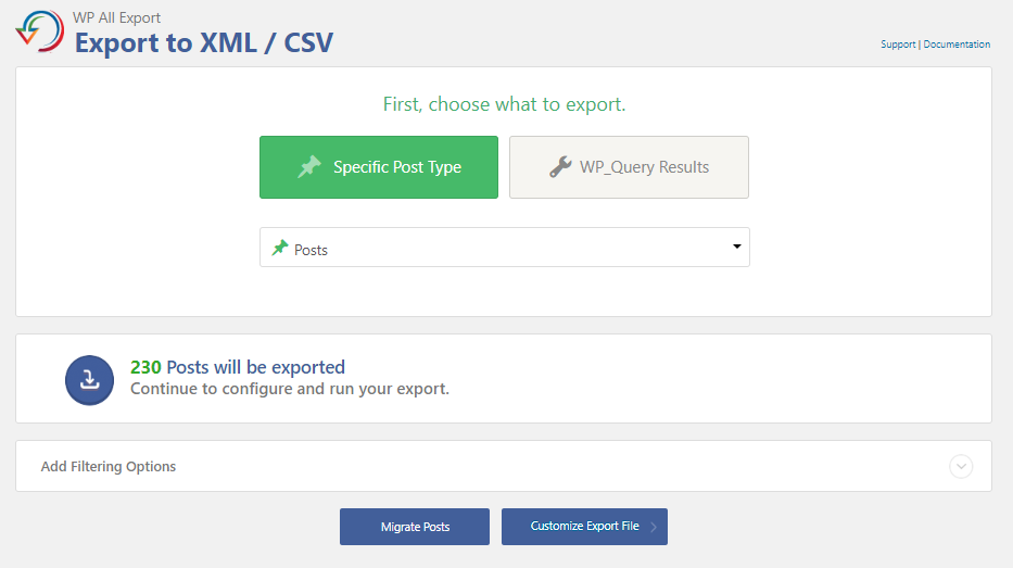 Select “Post Type” – “Posts” or “Pages” from the drop-down depending on which ones you wish to migrate and click on “Customize Export File”