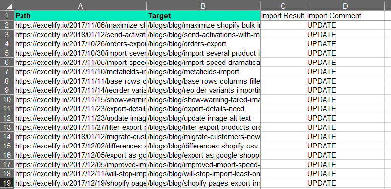 This file should contain two sheets – “Blog Posts” or “Pages” and “Redirects“.