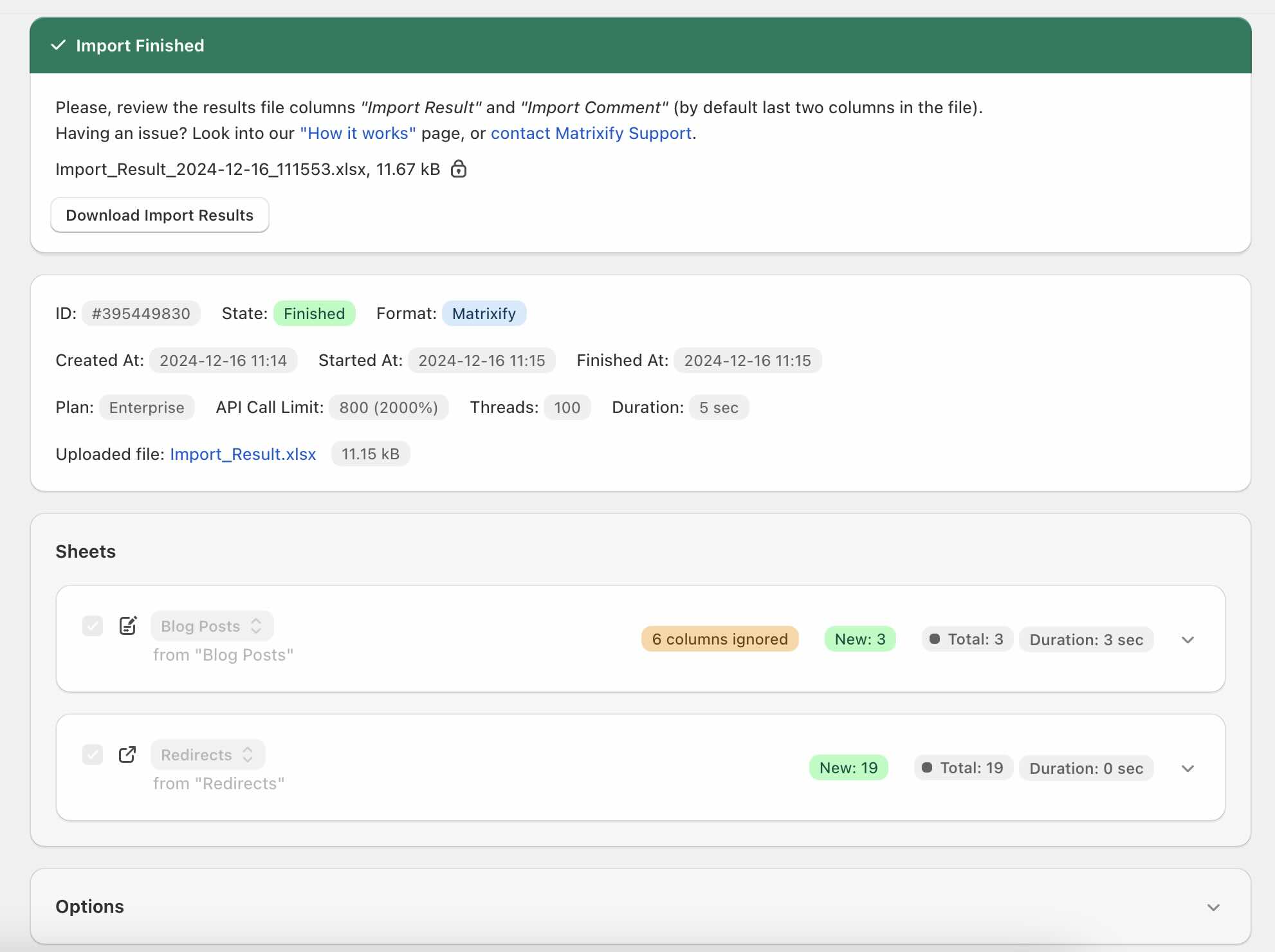 Note – you do not need to keep the app open while the job is running as the app is working on it on our servers. You are free to close the app and by default store owner will receive an email about a finished job (can be edited in Matrixify app Settings). You can always find this job in the app by going into “All Jobs” page.