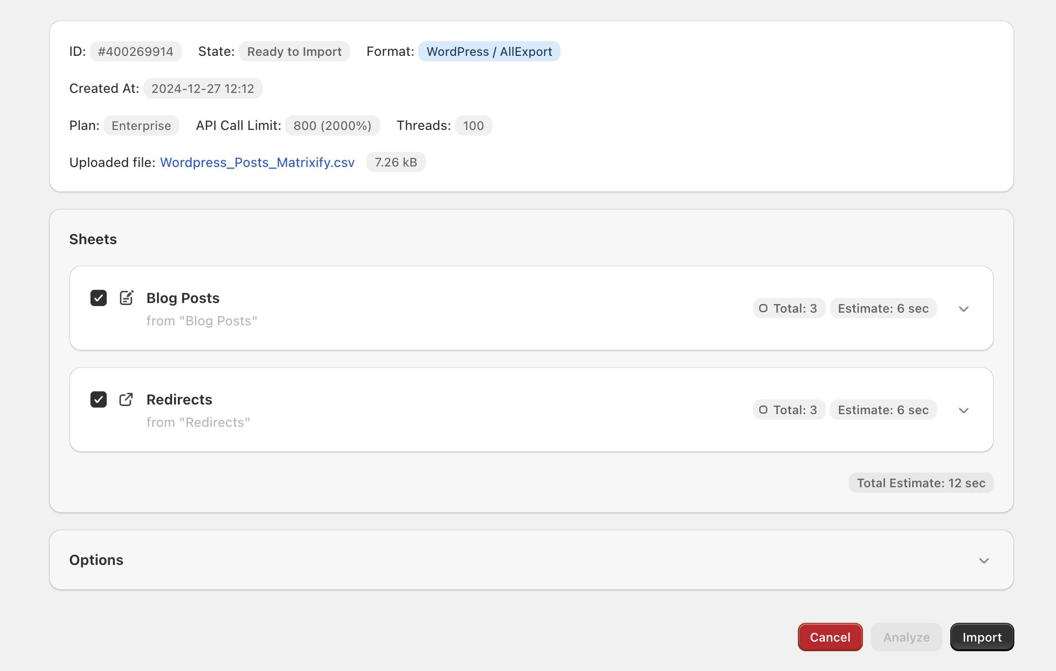 Once the file is uploaded and analyzed, make sure that the app recognizes the contents as Blog Posts and Redirects, since you are now uploading Matrixify template file then you will also see that format is “Matrixify“.