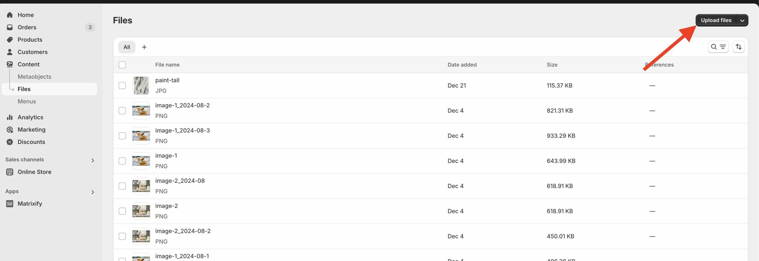 Now head into your Shopify Admin Files section by going in Shopify Content -> Files and press the “Upload” button to upload your files.