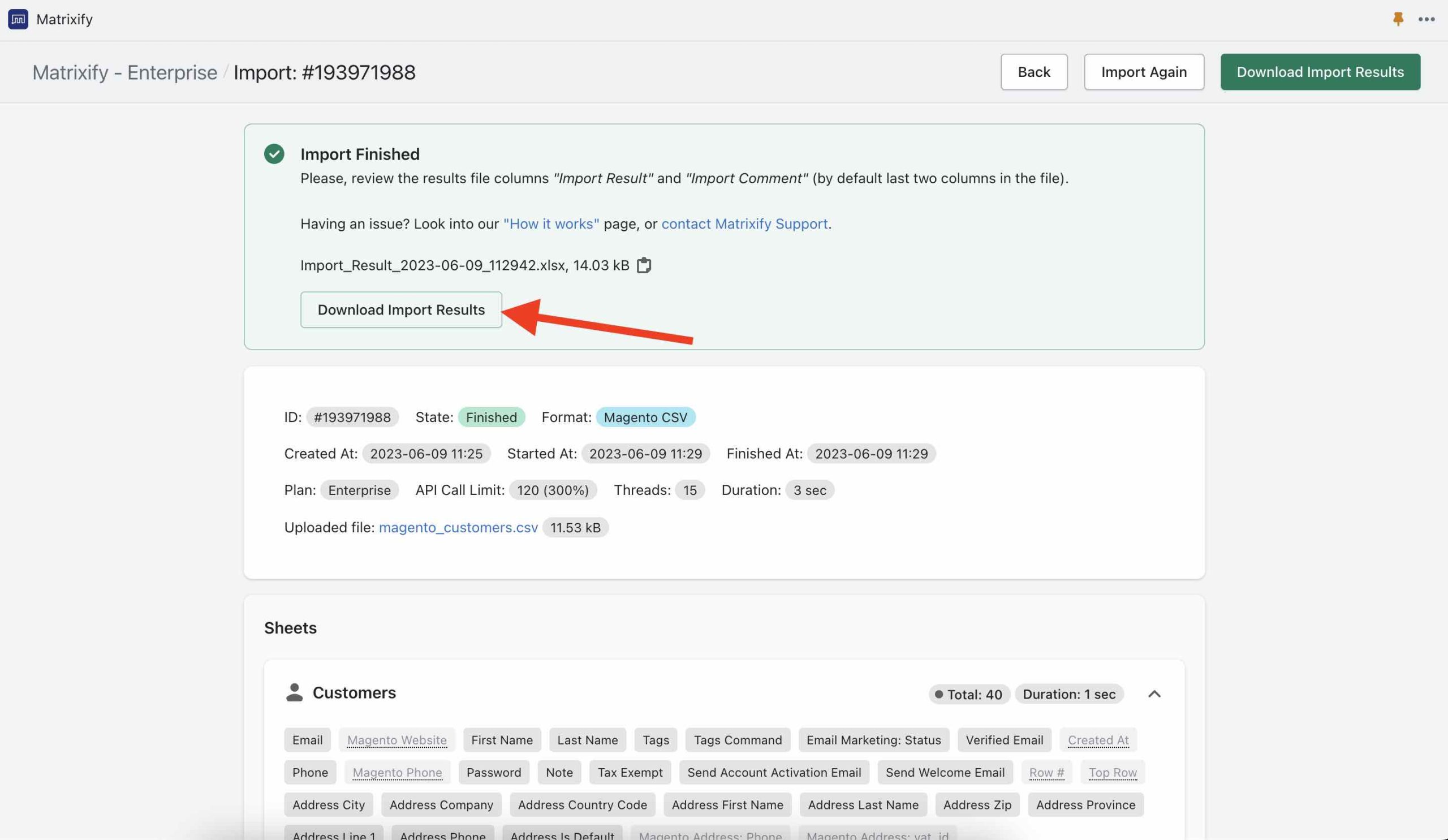 After the Dry run is finished, download the “Import Results” file: