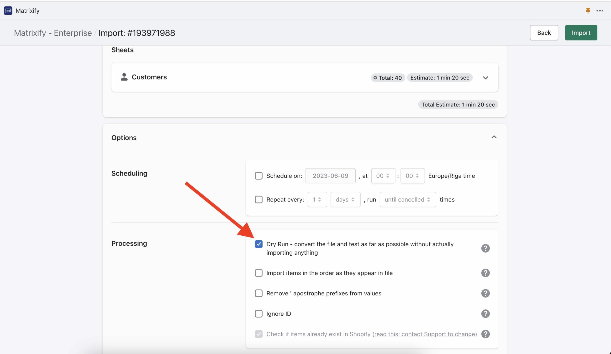 Doing the Dry run will just run through the file conversion process and will generate you the “Import Results” file in the Matrixify format – as if you imported it, but it will not actually import anything just yet.