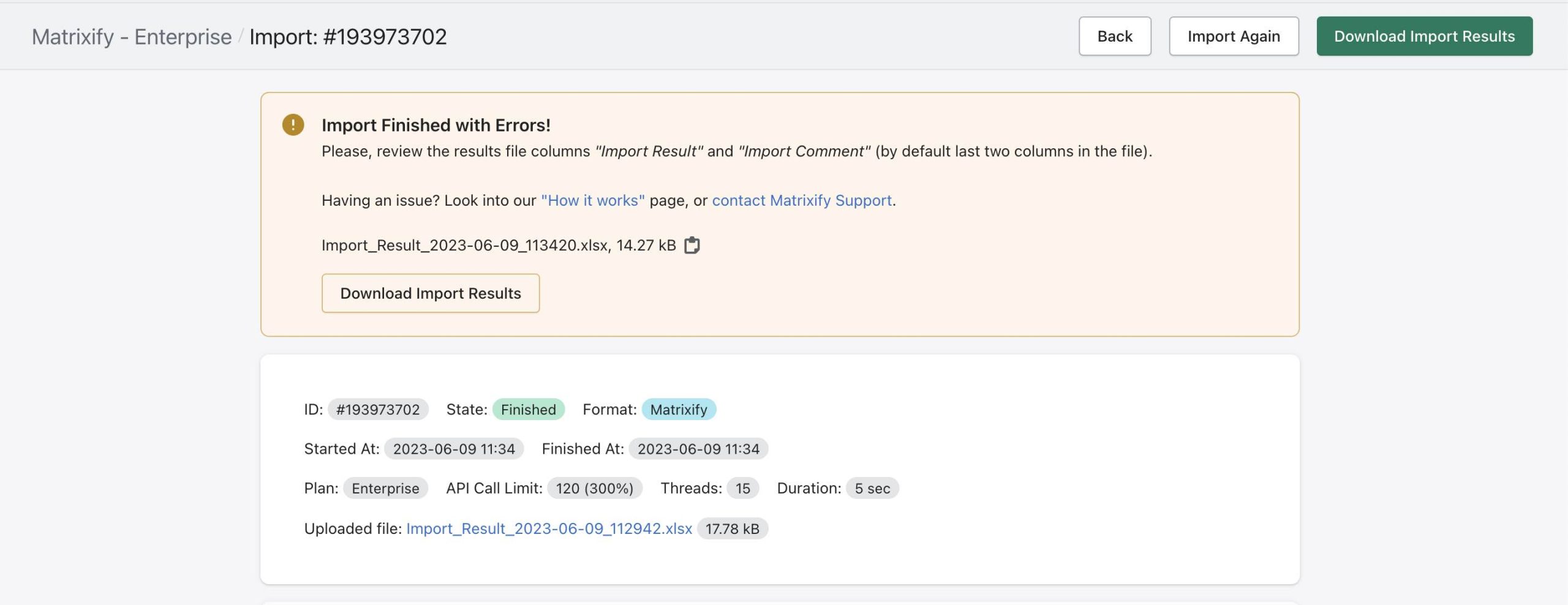 Take the Excel file which you have updated and prepared for the import, and upload it again to the Matrixify app.