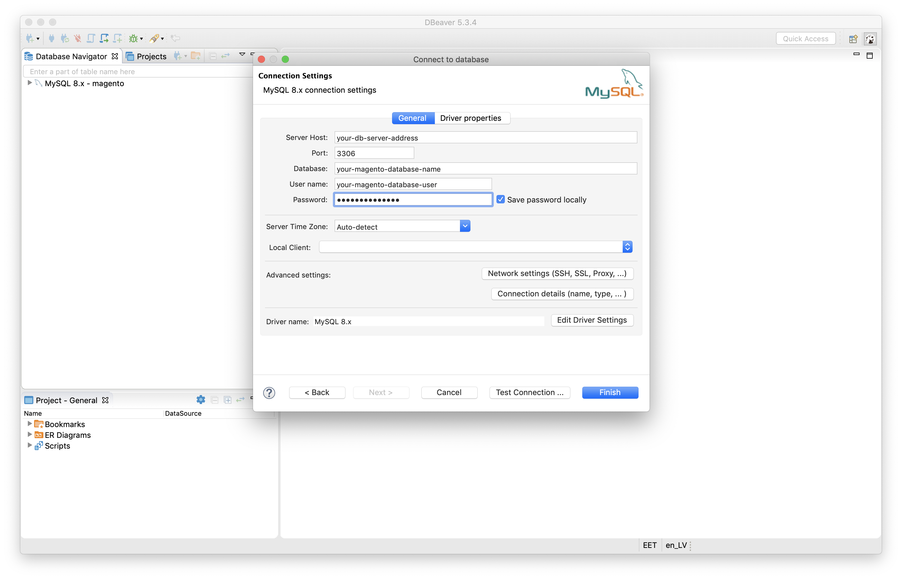 Quite often your Magento database is running on some other server which you need to “tunnel” in. In that case, you will have additional “server” login details which you need to press the “Network settings (SSH, SSL, Proxy, …)” button and enter this data there.