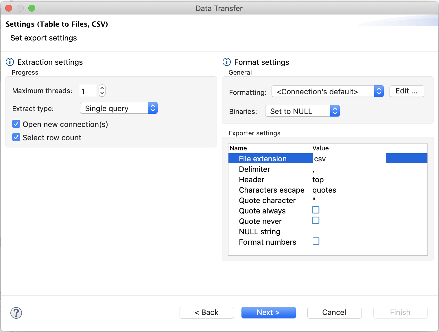 Choose the export directory – where to place those CSV files. A good place to put those is in the Downloads directory: