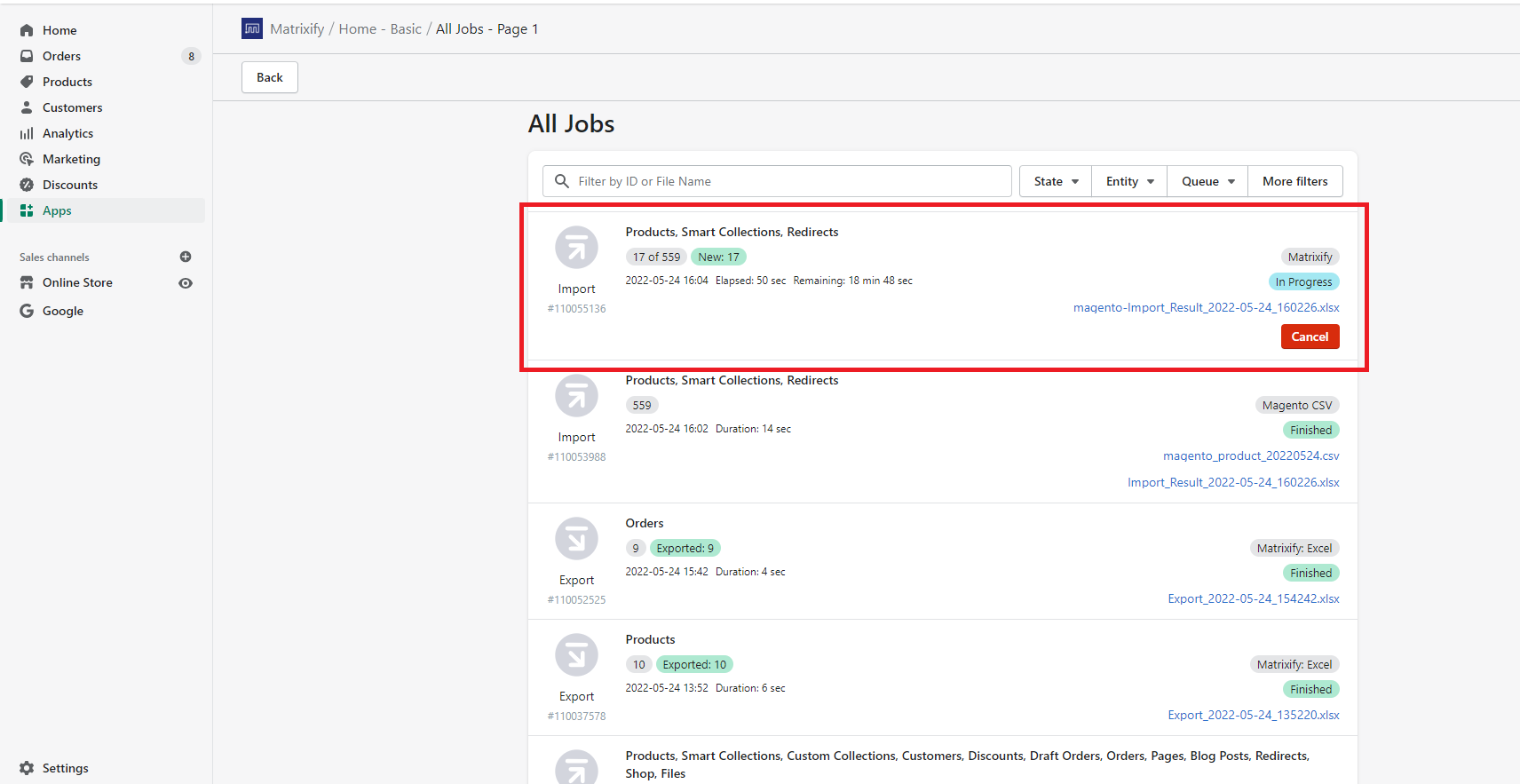 Doing the Dry run will just run through the file conversion process and will generate you the “Import Results” file in the Matrixify format – as if you imported it, but it will not actually import anything just yet.