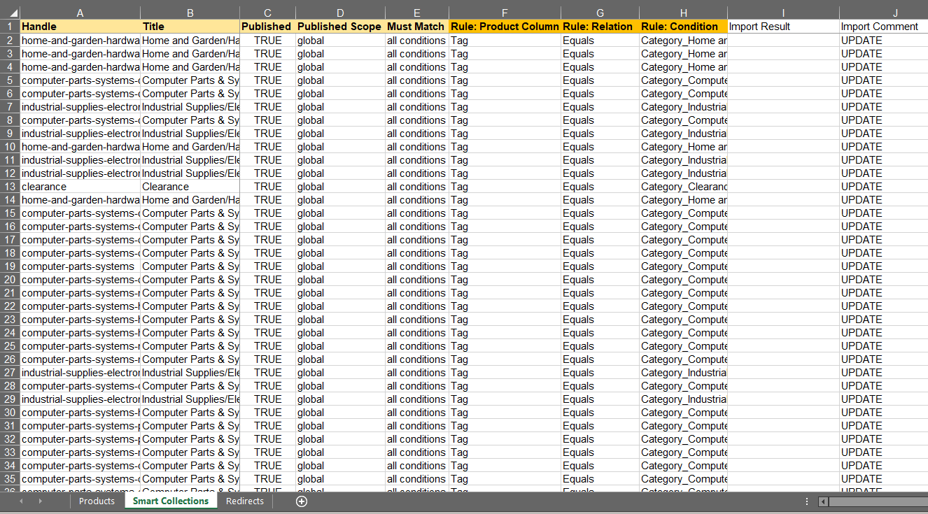 The same as with Products sheet – you can change anything you like here. Also, there are more fields you can import for the Smart Collections – for that, please, look into the Matrixify template or read the Smart Collections fields documentation.