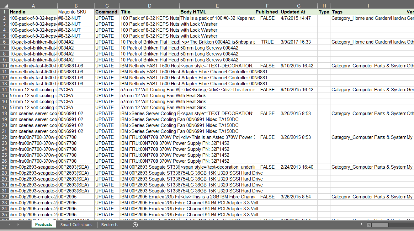 Note the “Tags” column – those contain the categories from your Magento store. They are in the format with _ (underscore) because some Shopify Themes recognize those as group filters which will result in nice Category filters.