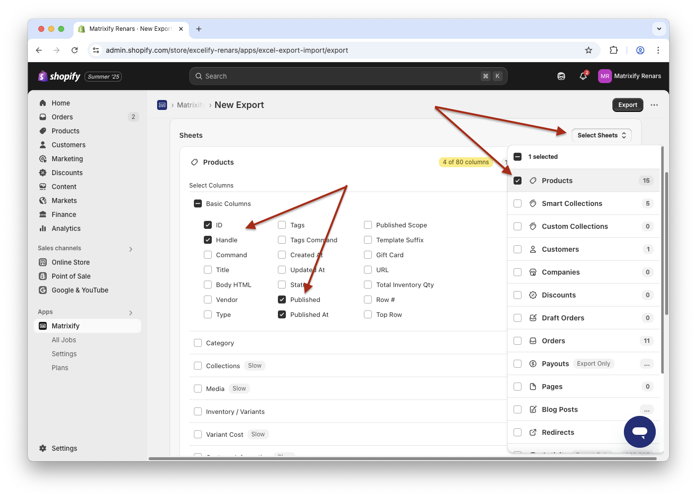 For the Products sheet, open the Basic Columns dropdown and select only columns – ID, Handle, Published and Published At.