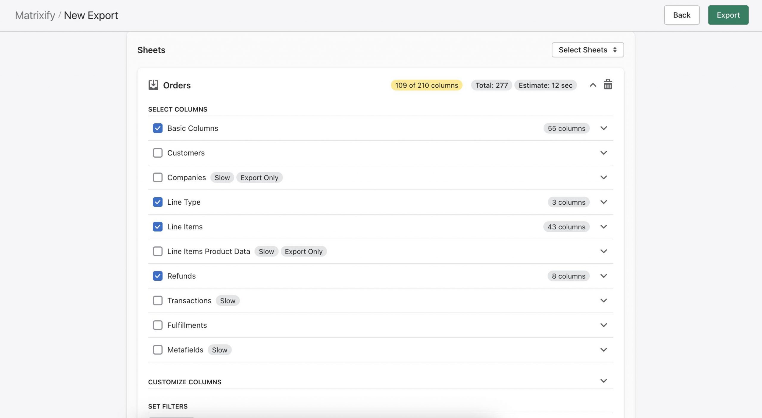 You can select to Export Orders by checking the “Orders” checkbox in the “Select Sheets” drop-down. Your Export setup should look like this: