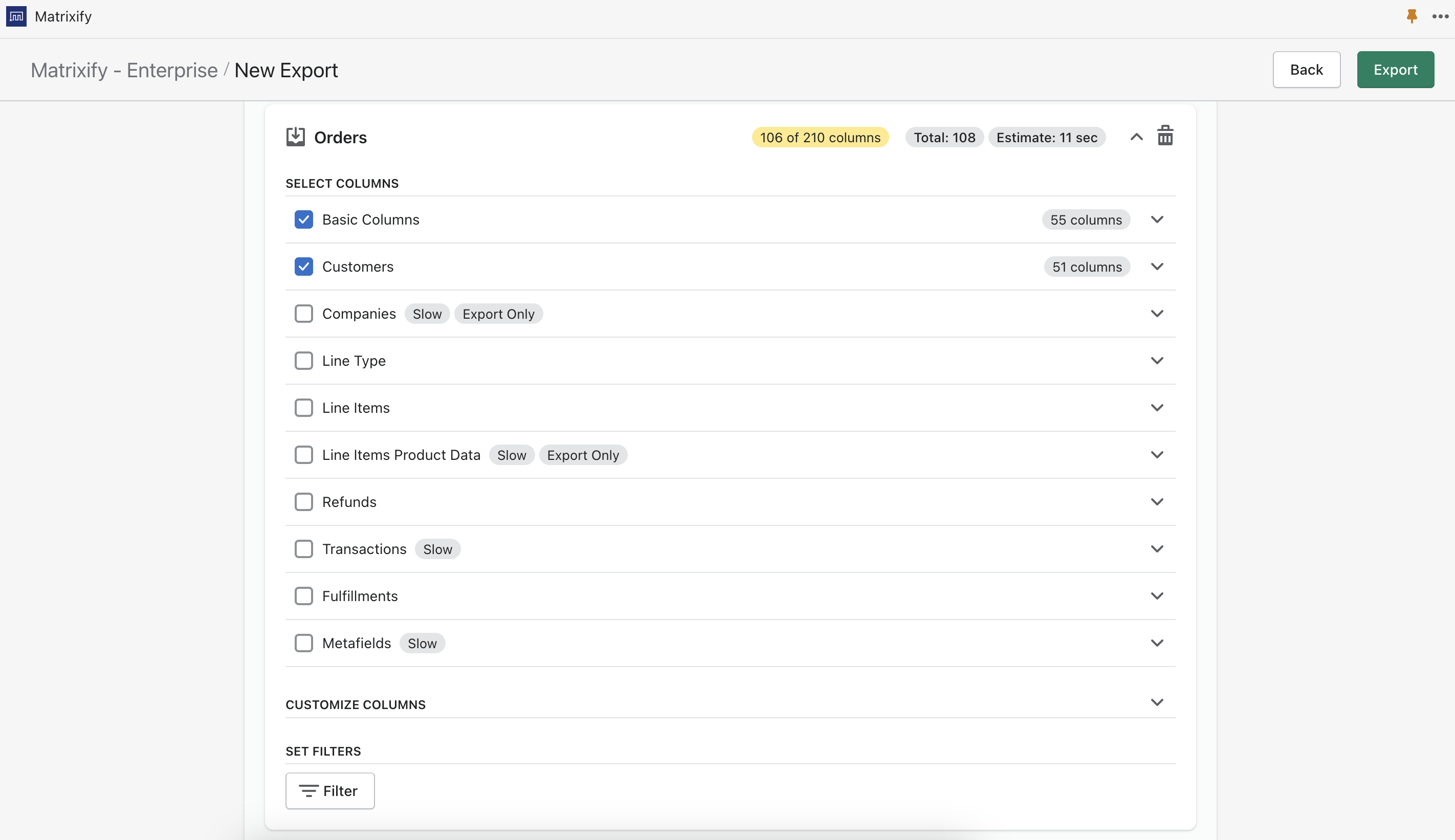 In the export section of the app select checkbox “Orders” from the “Select Sheets” drop-down and under Orders select the “Customers” and “Basic Columns” checkboxes.