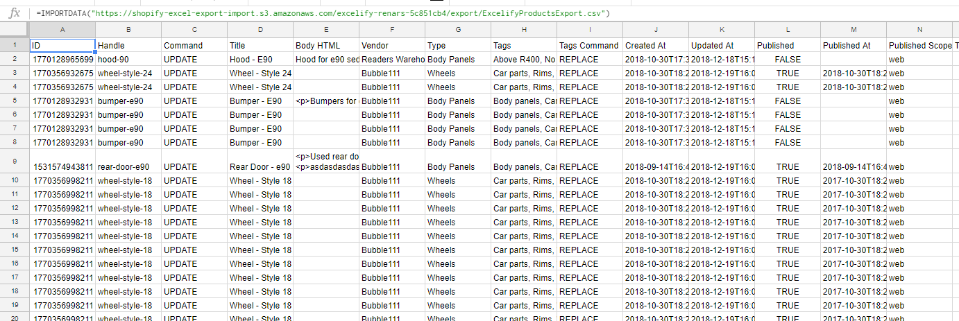 - Afterwards, you can construct another sheet named ‘Products’ and reference information from this imported sheet to construct a file to import back into Matrixify from Google Sheet. More info about how to import from Google Sheets.