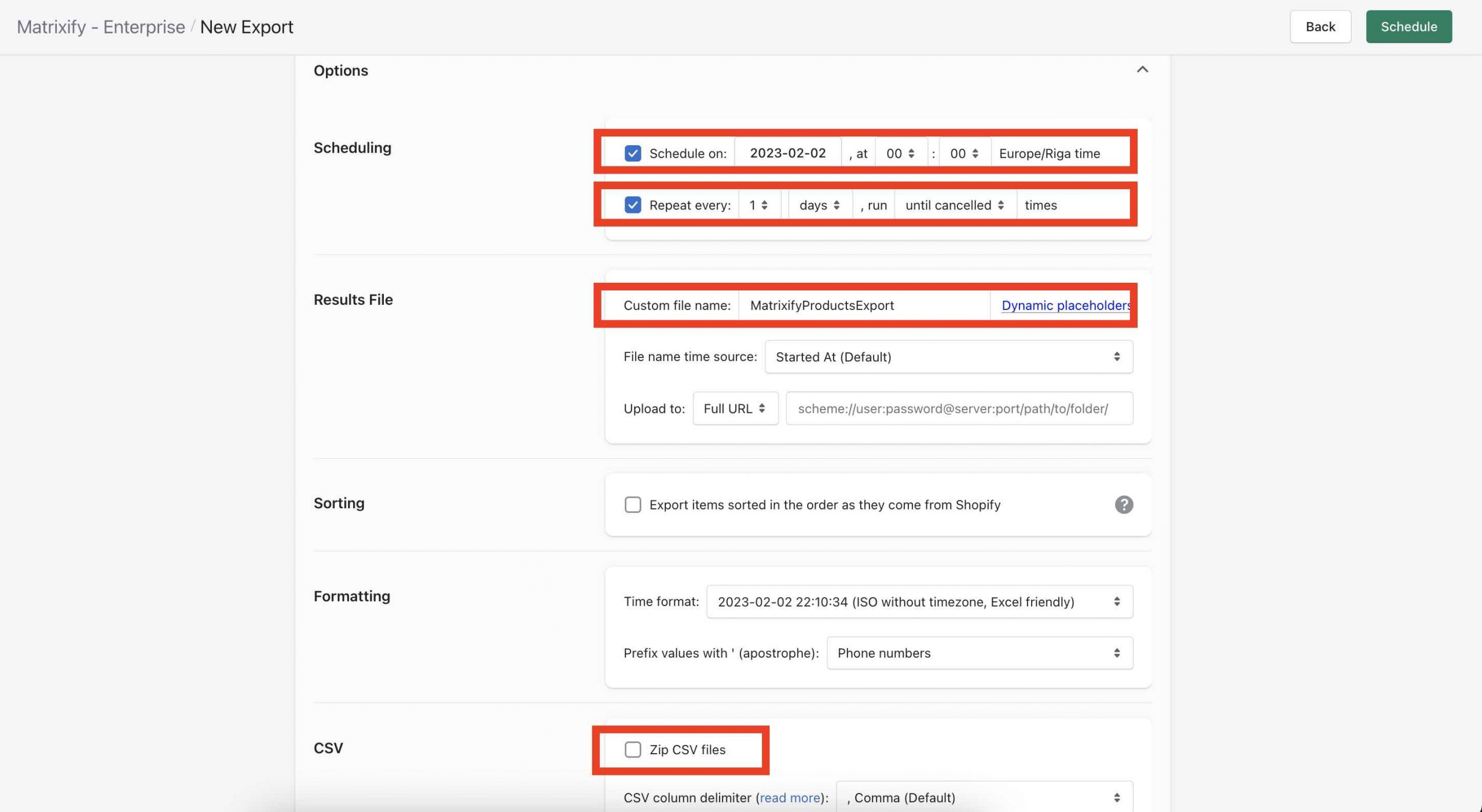 - Uncheck – Zip CSV files.