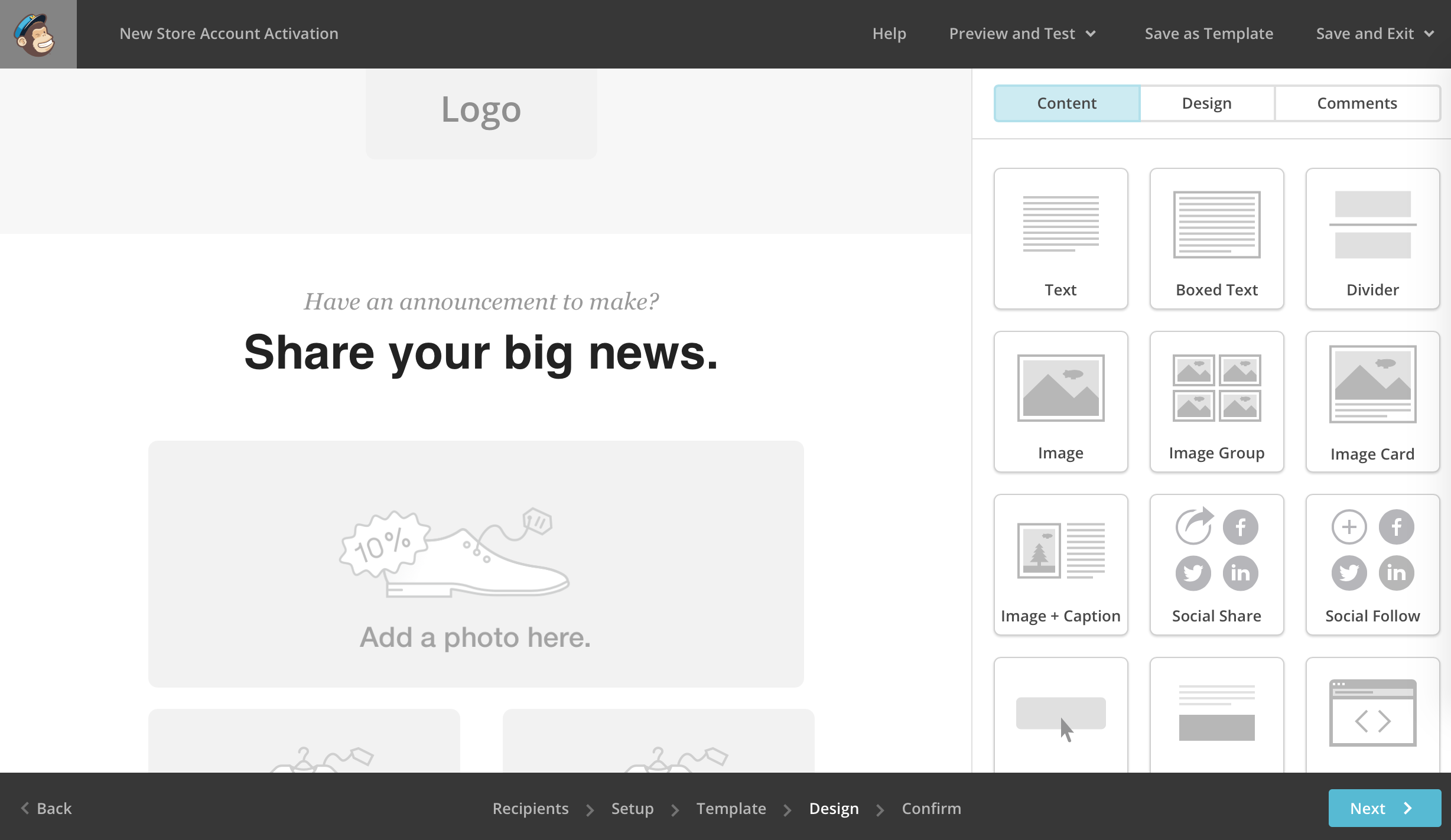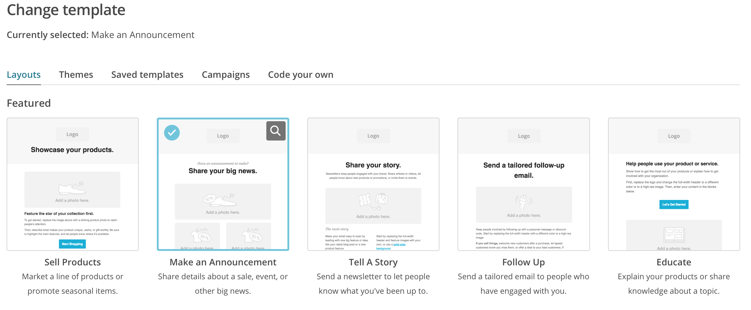 MailChimp provides a lot of templates for email campaigns. I will choose “Make an Announcement” template
