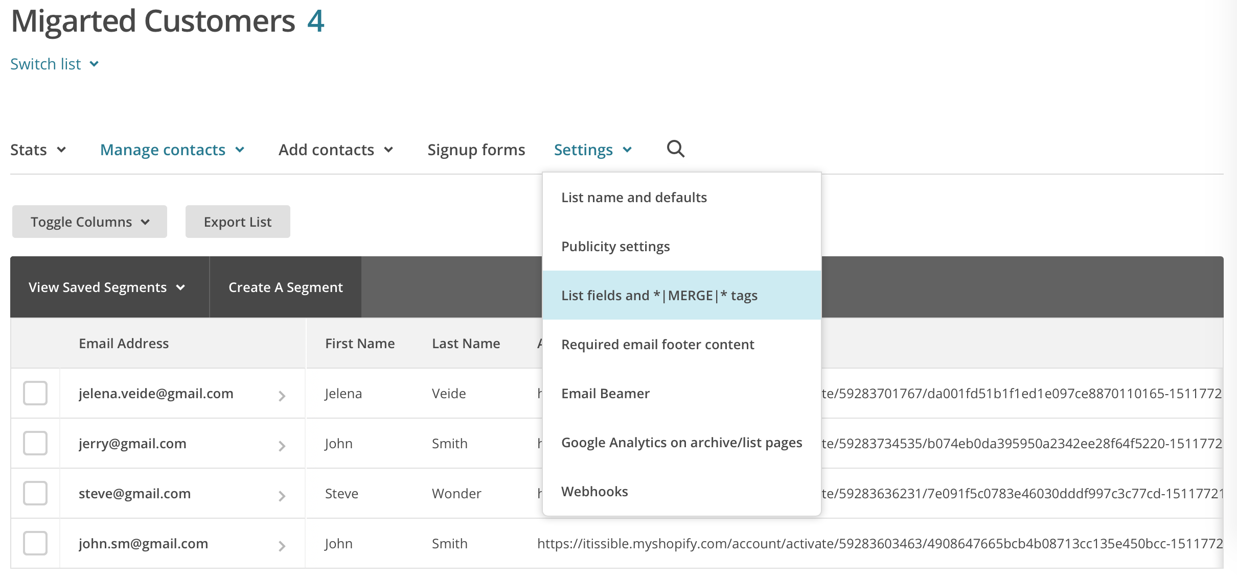 We will do one more thing. Go to the Lists. Open Migrated Customers list. Click Settings -> List fields and *| MERGE |* tags