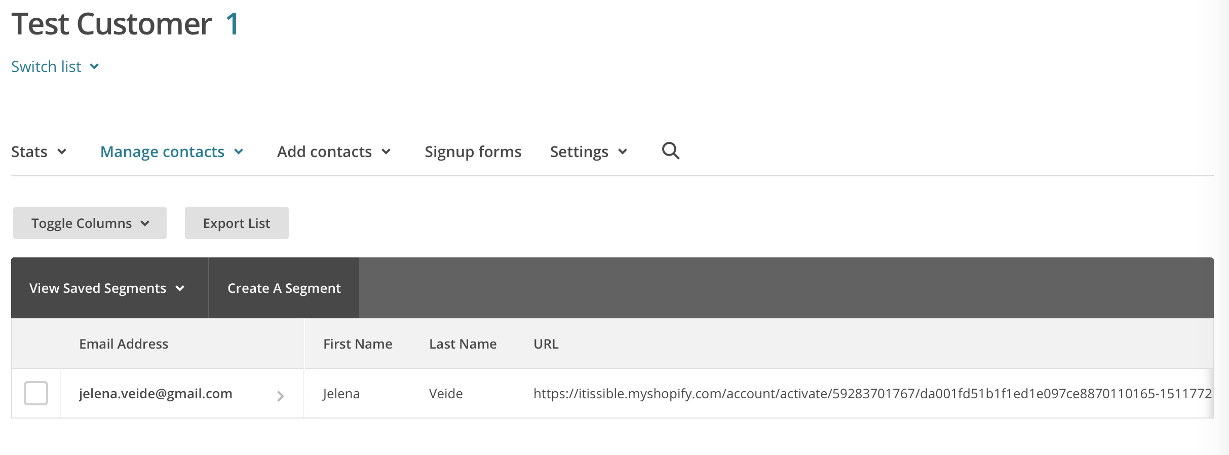 For the testing purposes I will create one more List and call it Test Customer. This list will contain only one customer with my own email. I will copy real Activation URL (from the Excel) and also add field tags as in the previous step. With this list I will test, if email is sent as I wanted it to be and if Activation URL is working correctly.