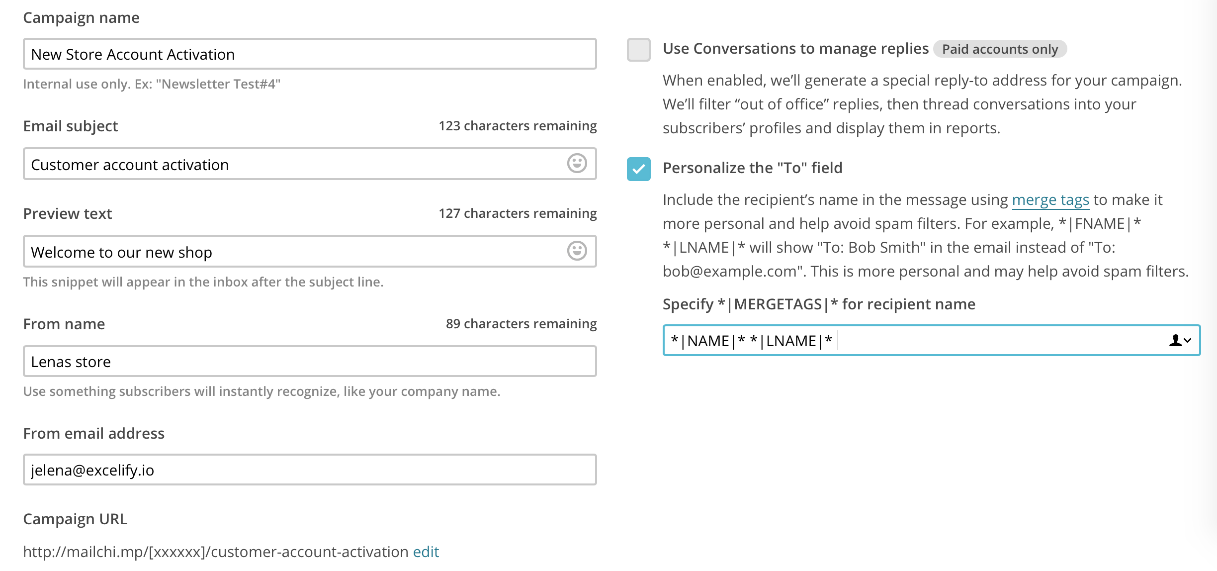 Pay attention to the checkbox Personalize the ‘To” field. I Check it and put field tag *|NAME|* *|LNAME|* in recipient name. Remember, we added these tags earlier, when creating the list? So, now each customer will get the personalized email, with his/her First name and Last name as the recipient.