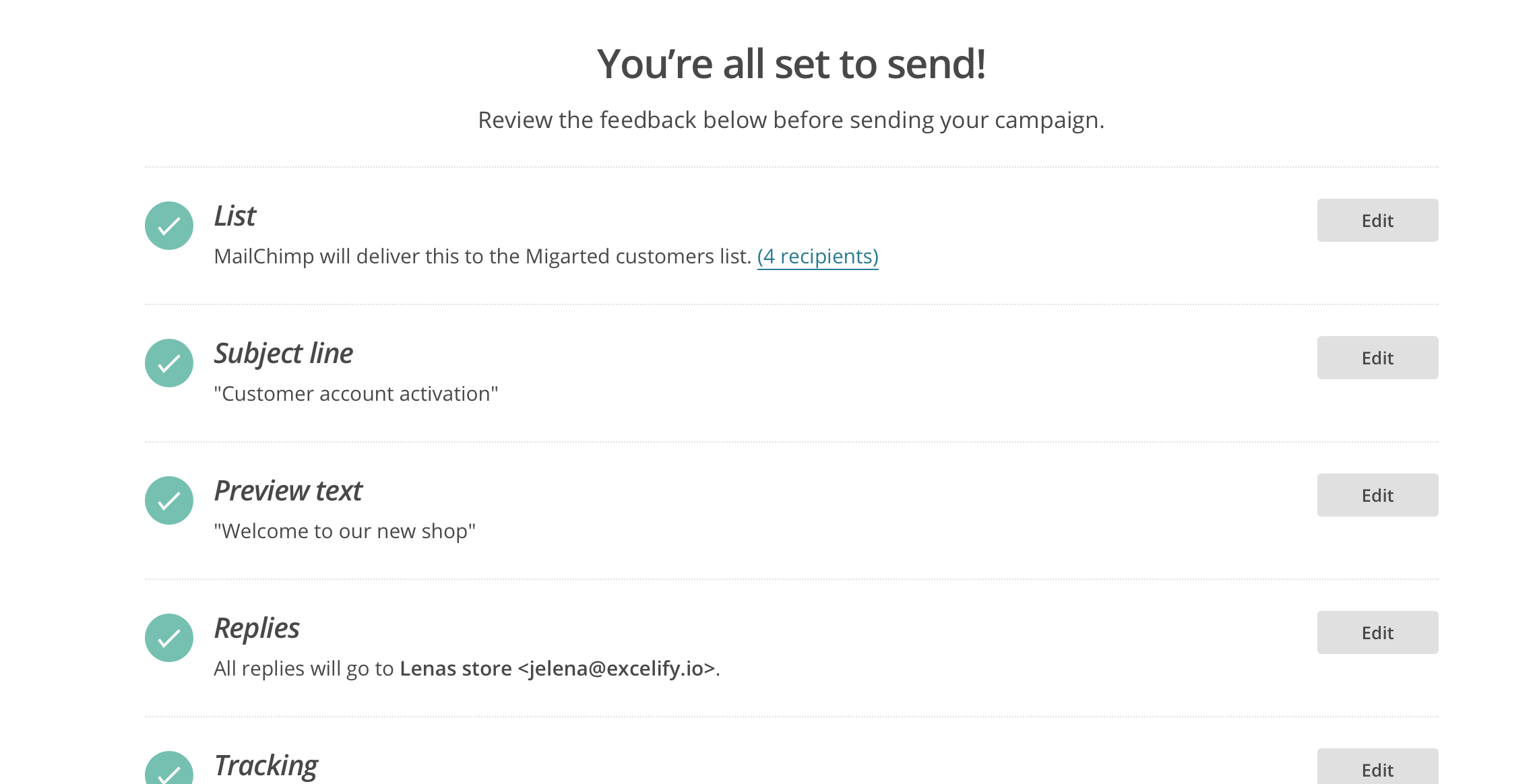 There is a service MailChimp, that allows to send notifications, campaigns, newsletters etc. to lists of customers. As we want to send Account activation emails to several customers at a time, let’s first create the list of customers.