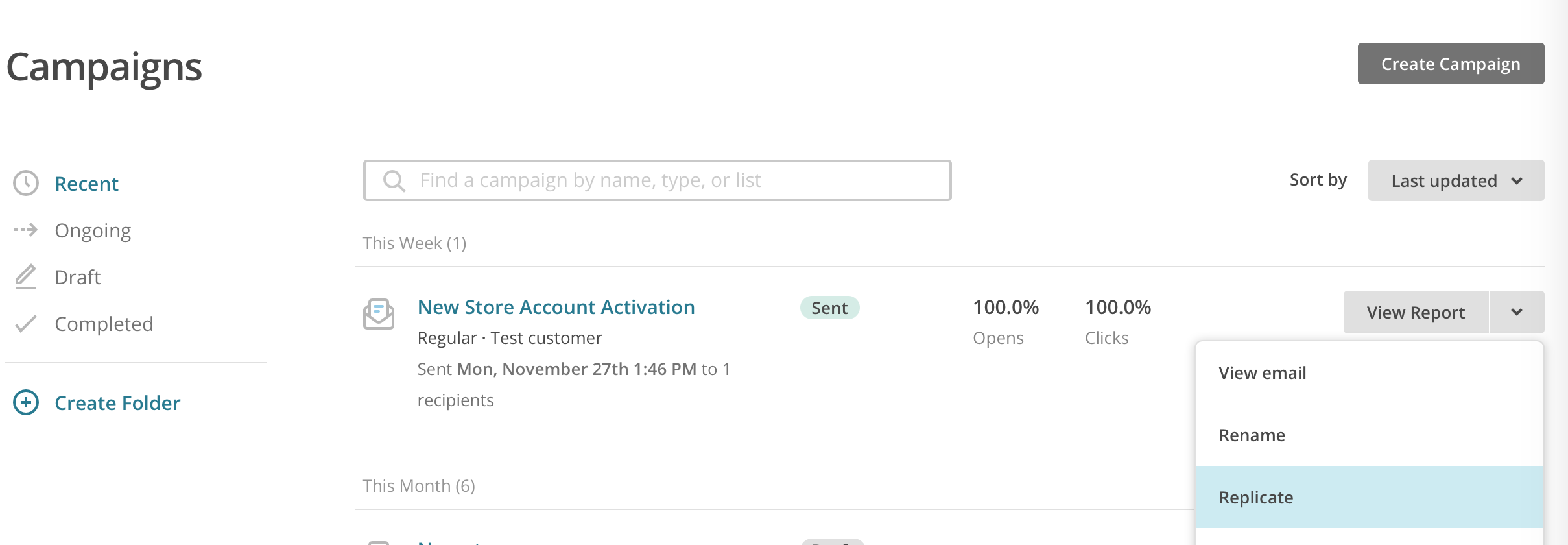 Go Campaigns. For the New Store Account Activation campaign choose Replicate