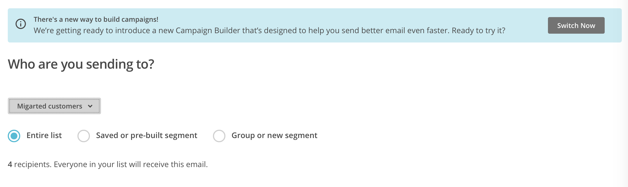 Now we need to create a New campaign in the MailChimp with what we will send the information to our customers and invite them to activate accounts. Click Campaigns -> [Create Campaign]
