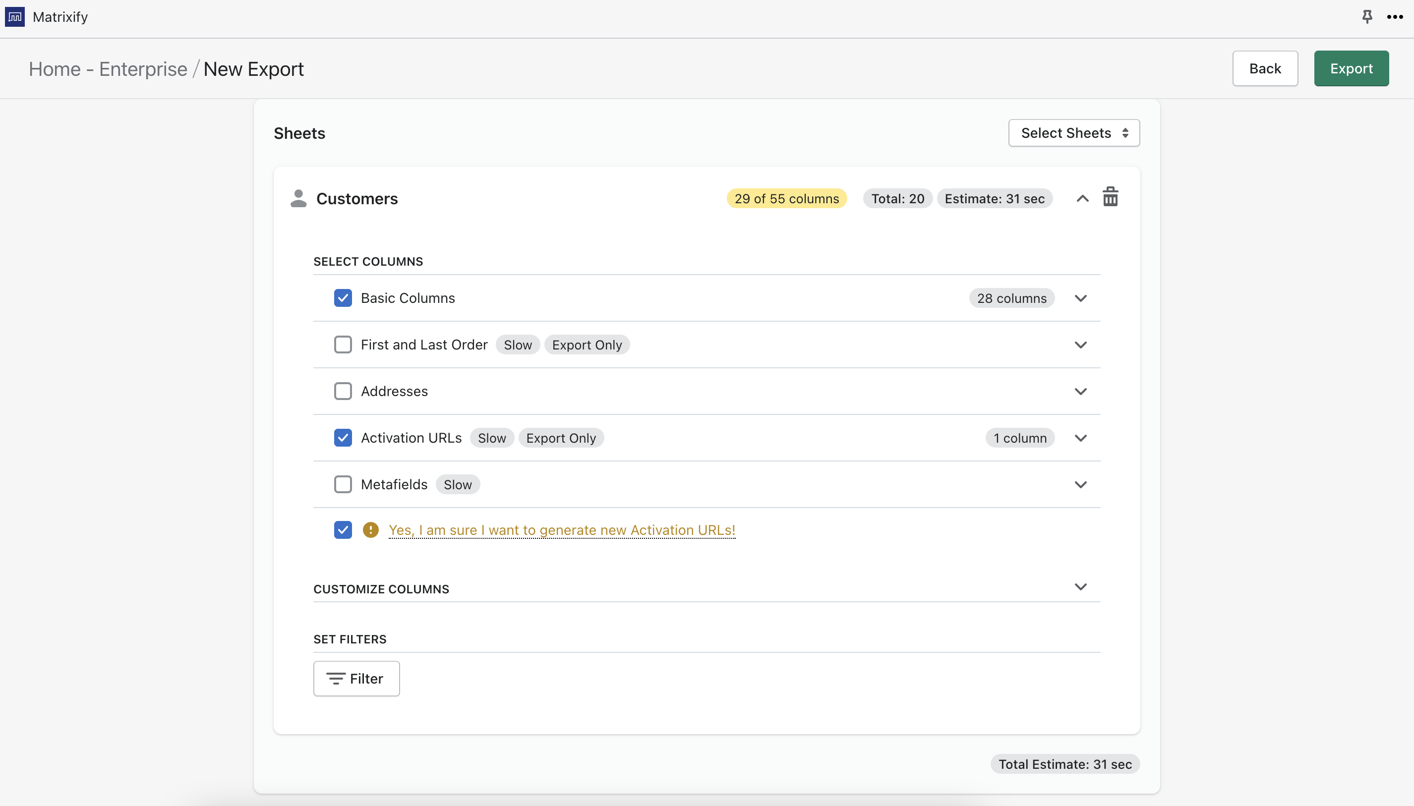 To get this data, we need to Export Customers with the Matrixify app. Create a new Export by clicking the “New Export” button. On the Export page, click the “Select Sheets” drop-down and check the checkbox for “Customers”. Then select “Basic Columns” and “Activation URLs”. Make sure to also check the checkbox “Yes, I am sure I want to generate new Activation URLs!”. Your Export should look something like this: