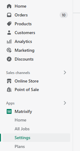 Find Settings section Shopify Side menu for Matrixify app: