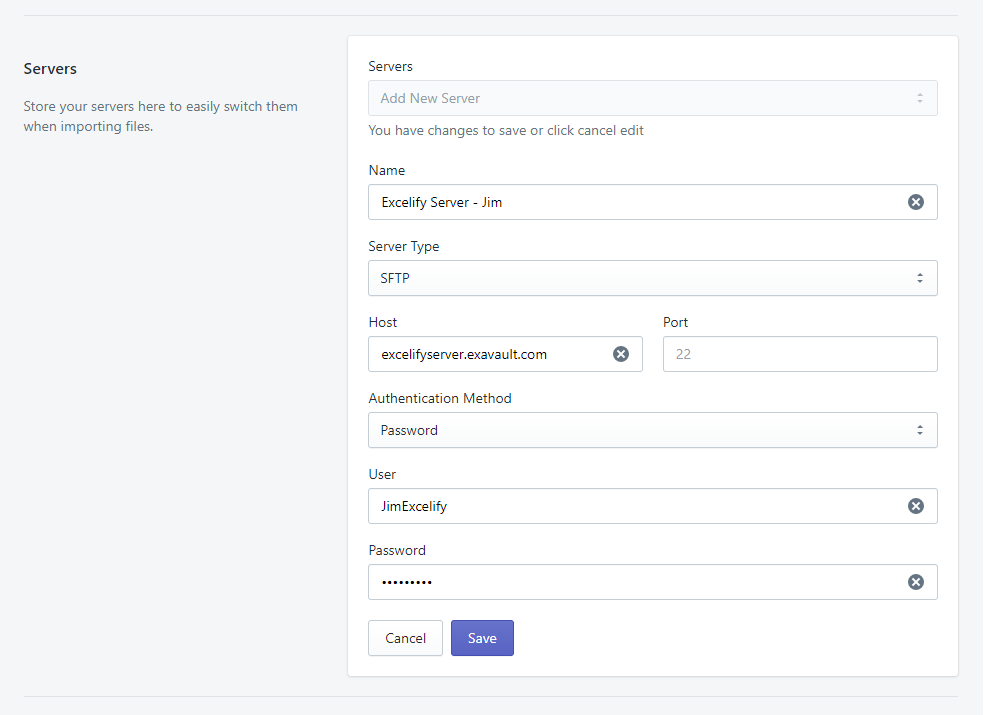 With Matrixify you can securely save your FTP/SFTP servers and their users so you do not need to fill in all details for each import and export, only specify the path to file/folder.