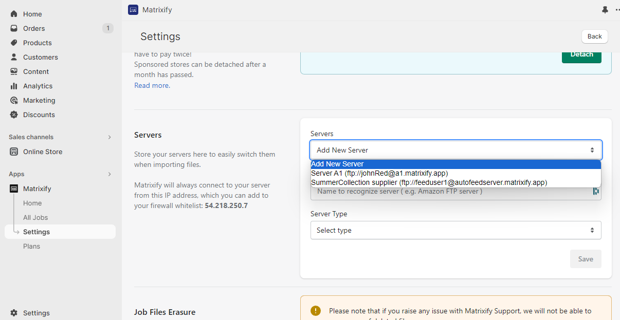 - You can always edit saved server details by going into Matrixify Settings -> Server section and selecting the server to edit.