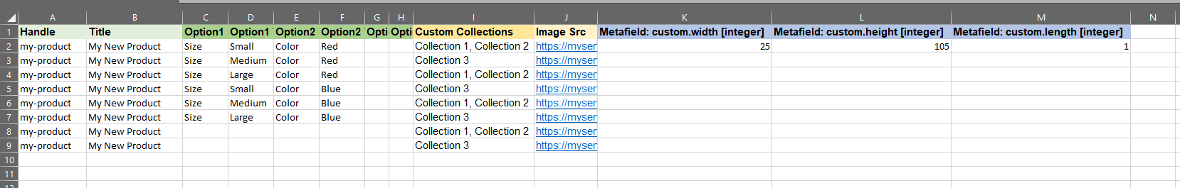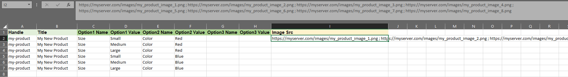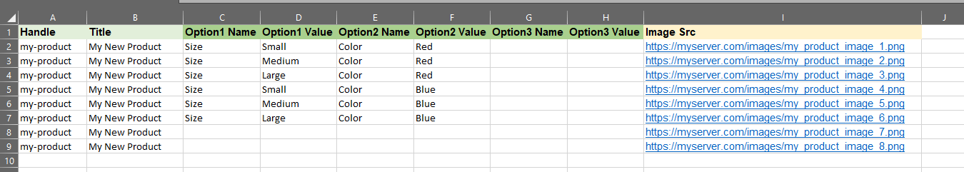 Note that the image rows don’t match up with variant rows – “Image Src” column images will be product images, and not the variant images.