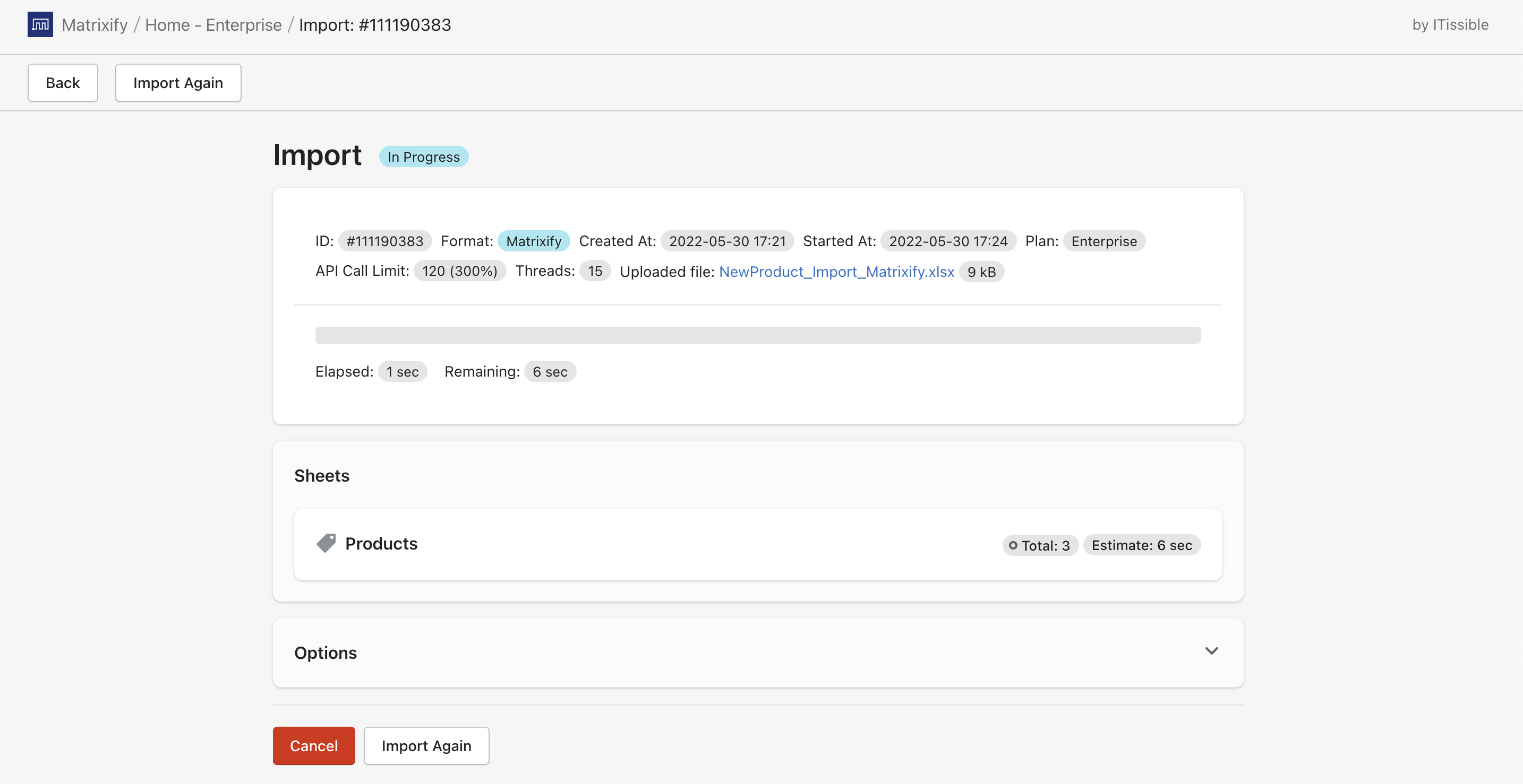 You can also see all the details about the job on this page, including what Options were applied, and the adjusted remaining time, and what is the import speed – seconds per Product.