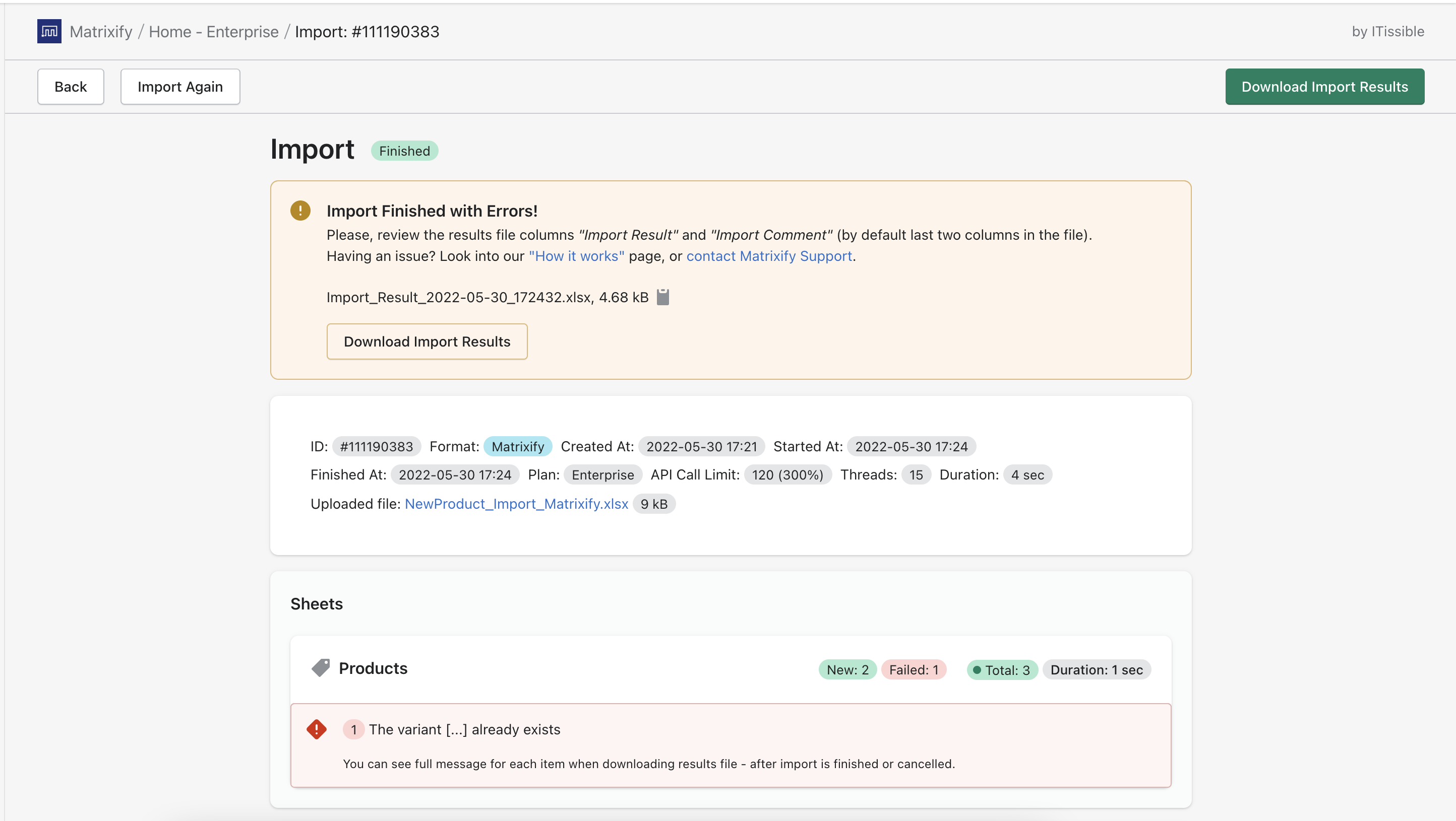 If some of the items failed to import then you can download the “Import Results” file to find the issue.