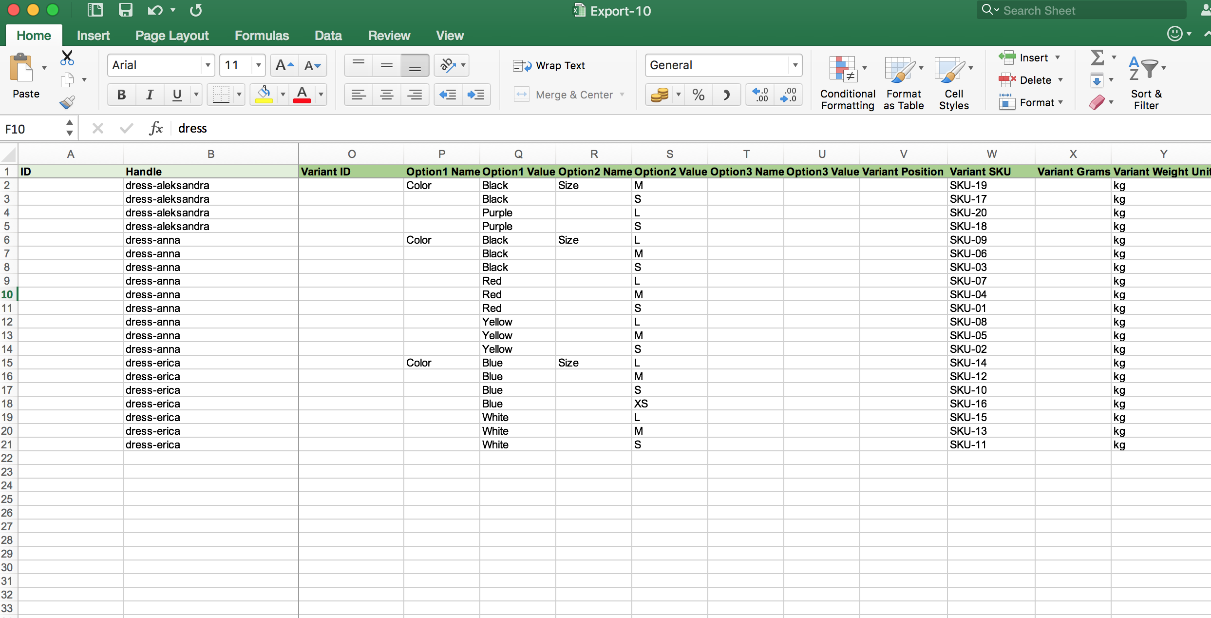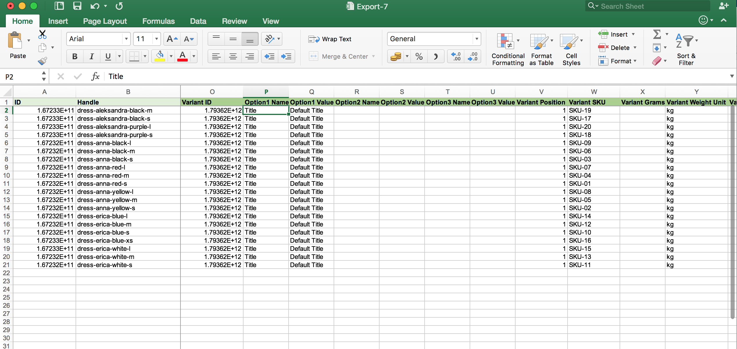 - Handle – set a new handle for each product. For example, if the handle was: dress-anna-red-s, now it will now only be dress-anna. This handle will be set for each variant of the Dress Anna product. You can use formulas or play with Excel (if creating your Import file in Excel) “split data” features to split your old handle into portions and then combine back as you need.