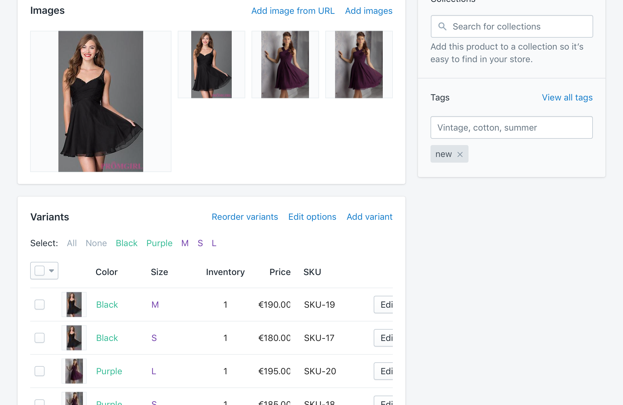- It is important, that you firstly add the new Products with variants and only then delete the old Products without variants, to keep all you images.