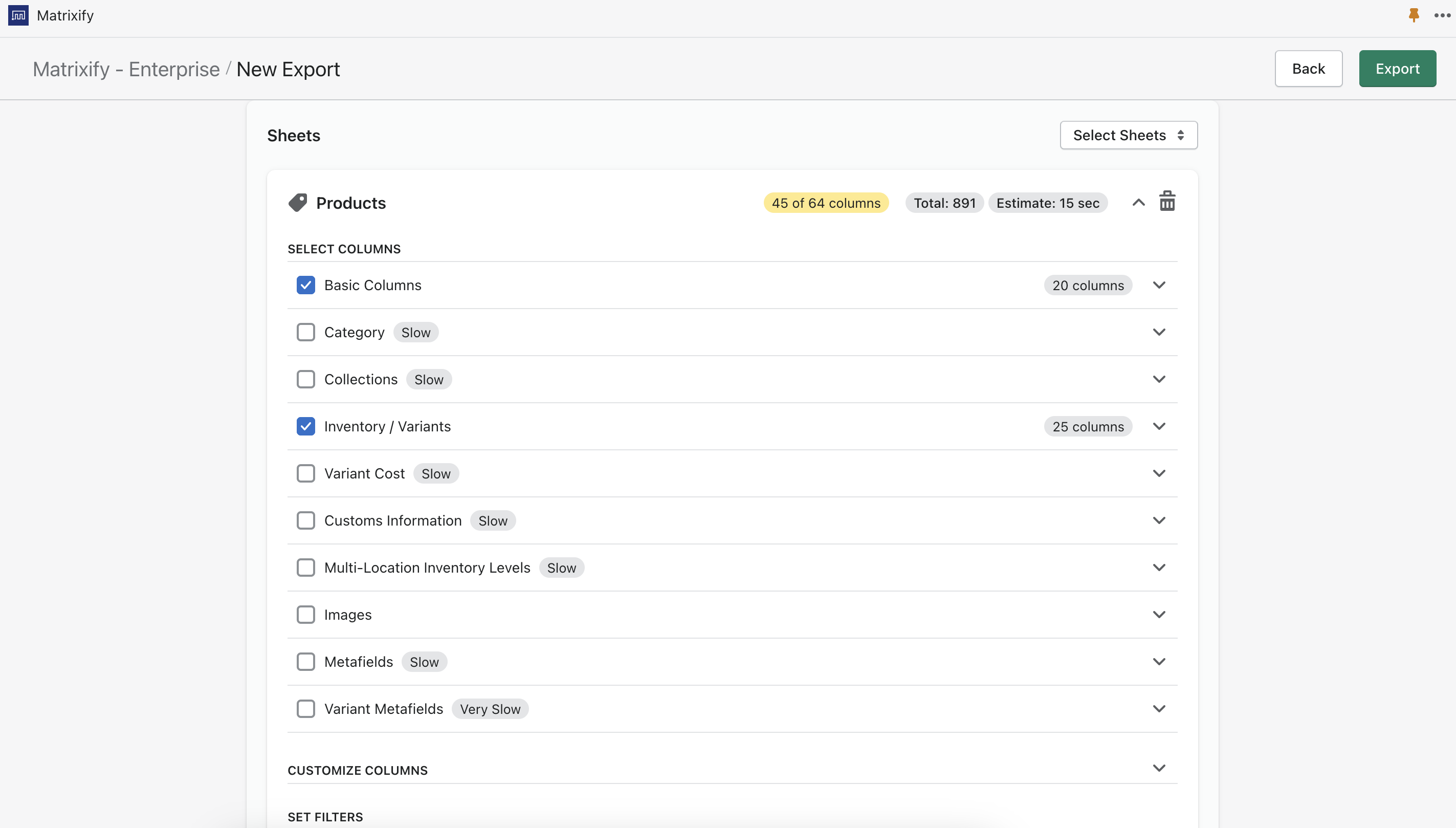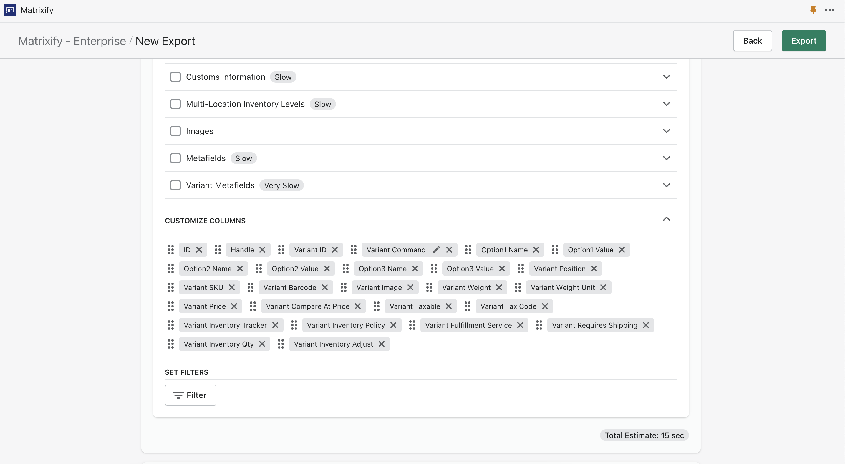 If you do not need to group all Products in your store you can apply filters to Export only the Products that you need. You can set filters by pressing the “Filter” button when creating your export. Read more about Filters in Matrixify “How it works” page.