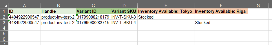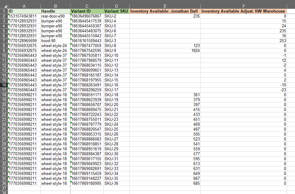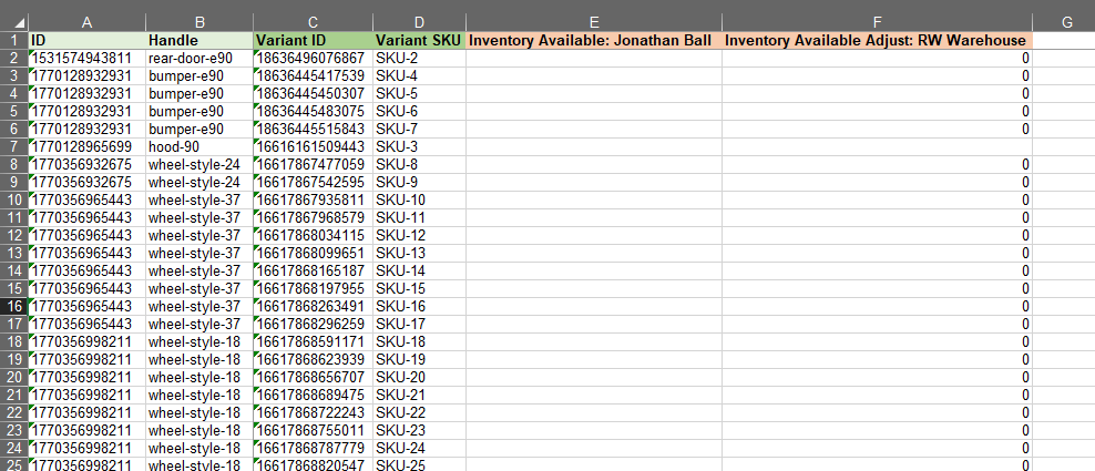 So in my example file, I will only wish to add a specific amount of items to one location named “RW Warehouse” and set specific inventory level at the location “Jonathan Ball”, so I only need columns “Inventory Available Adjust: RW Warehouse” and “Inventory Available: Jonathan Ball“