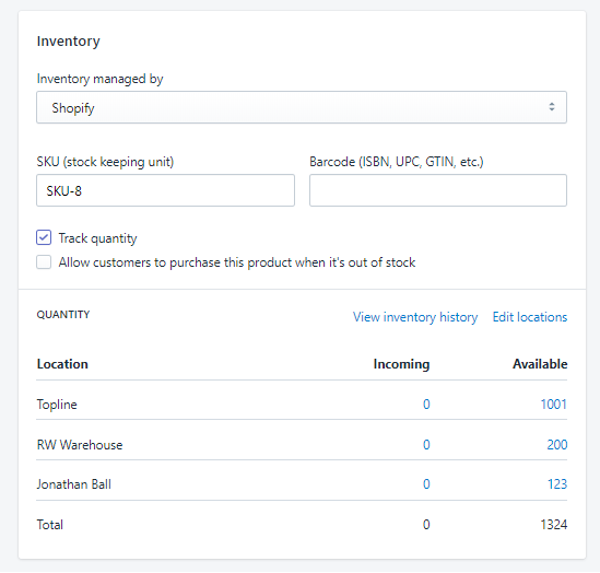 Shopify also allows you to specify at what locations you are stocking the inventory even when you do not have an inventory tracker turned on.