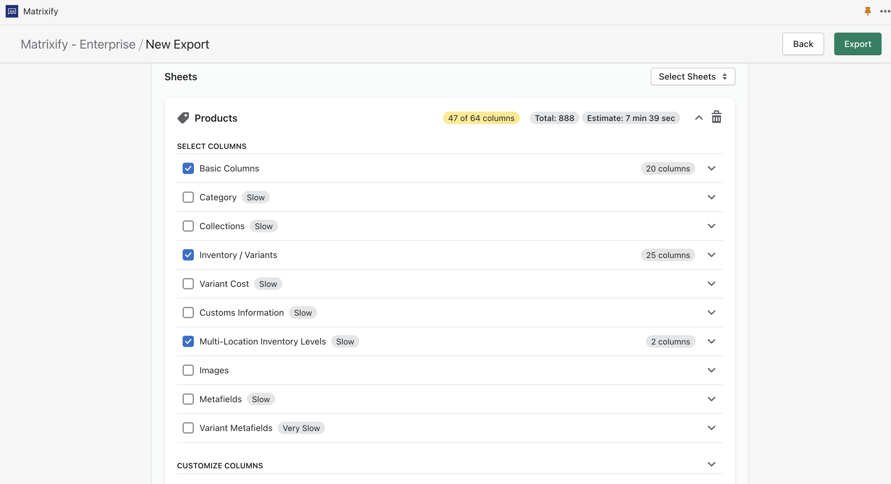 You do not require all the information about the products so you only need to select following checkboxes in Matrixify export section once you have checked “Products” from the “Select Sheets” drop-down: